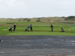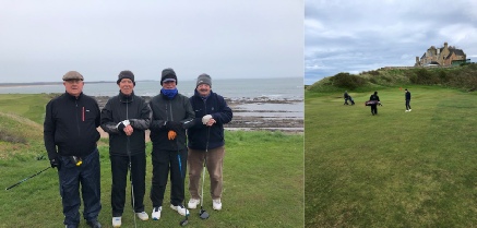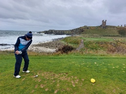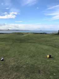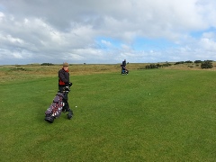 We were delighted to hear that it was only through a last moment of acute observation that our man hadn’t ended up at Dunbar!!!! He also added that he had managed to comprehend that we were due to start sometime around 11, and he wasn’t wrong there! Just to round this episode off, the spectators on the 1st tee were treated to the sight of your man addressing his ball with shoelaces undone, jacket hanging open and a longish scarf flapping about his neck before sending the projectile straight down the middle of the fairway about 30 yards past his playing companions.