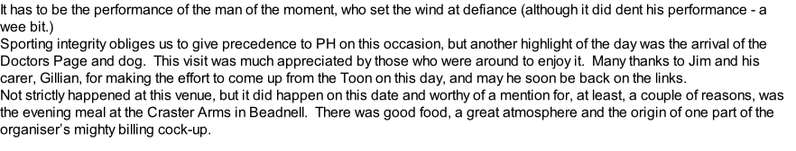 This was the first outing under the new lower fees membership rules where £5 is collected on the day from each player and becomes the prize for the day. Kenny's winnings were £60 and some of it was spent on an "Auchentoshan" for the roving reporter (everyone has a price.)