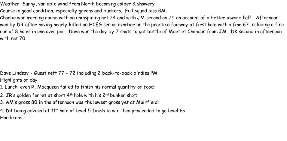 Weather: Nice day - very warm in the afternoon, course fast, but good. Guest D. Lindsay, caused by absence of CD.