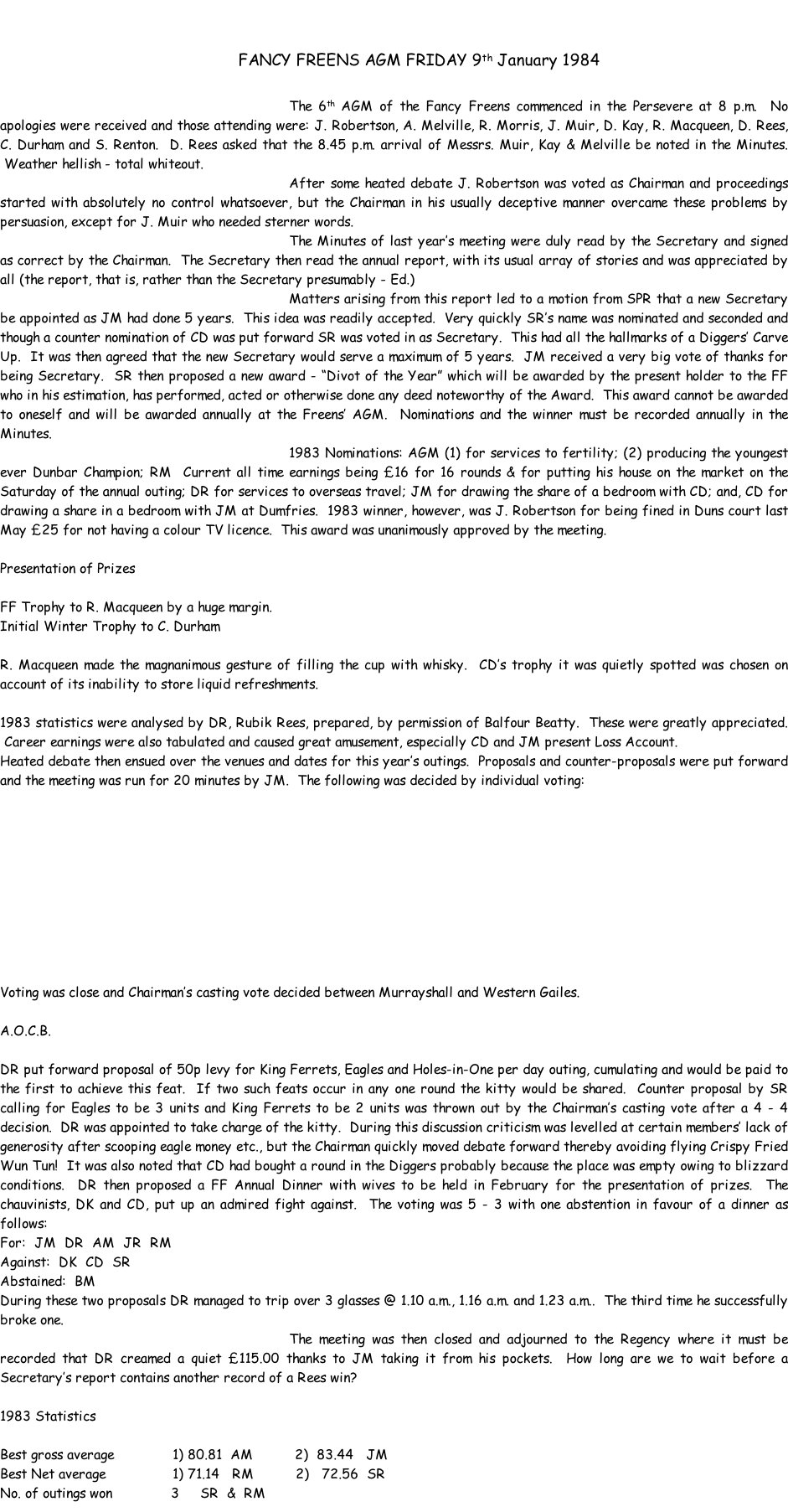 Winners: Morning - R. Macqueen with a fine 68 nett. B. Morris won p.m. with a magnificent 57 nett, A.M. Second a.m. and JM second p.m.. BM won the day with DK’s fine litre bottle of Cointreau