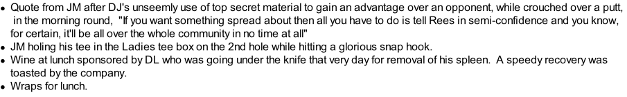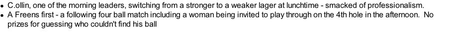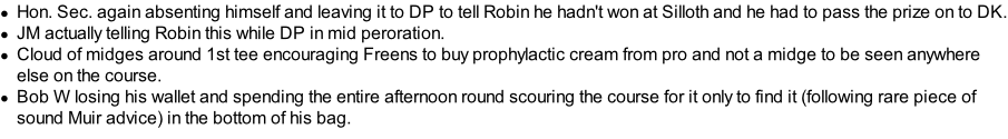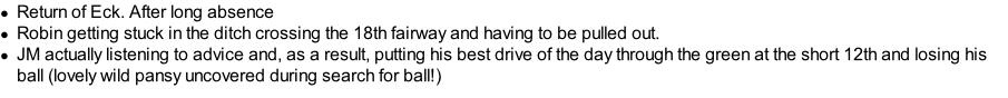 In a closely fought contest JM triumphed by a stroke from JR and DP with an even more obscenely high score than at our last outing. This takes his season's tally to three wins out of a possible four - a striking testament to the paucity and poverty of the rest of the field. Course very playable, with excellent greens, but wet, so there was little carry and the playing length was between 6,500 to 6,700 yards. Not perfect conditions for Freens, especially with howling gale.