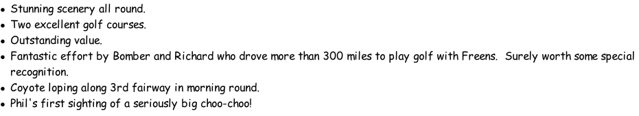 Drive to the south to a typical American (very hilly) course where buggies were essential for all flagging Freens. Advice given not to pursue balls into rough in order not to irritate the local rattlesnakes. Freens attain new levels of accuracy!