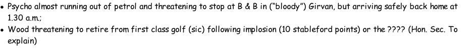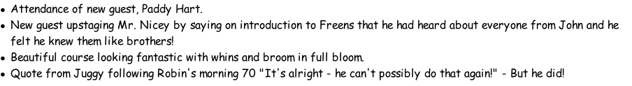 "What's in a name?" - a good deal if this is anything to go by, but that didn't deter Doog who followed on this year's pattern of gross winning scores in the 70s with a fine 72. This was too hot a pace for him to maintain in the afternoon, however, and Mr. Steady himself (see Montrose), Robin, stole in for the afternoon and the day with his second net 70.