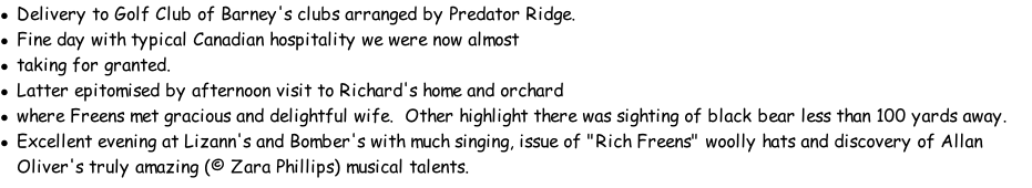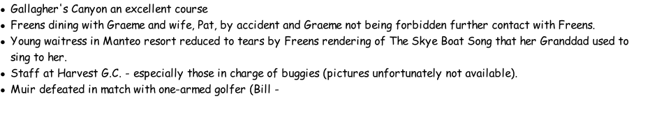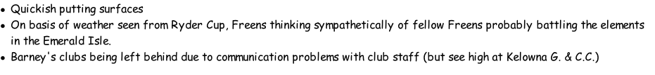 This was a golf/housing development set on hills a few miles from Kelowna. It aroused mixed feelings in the Freens, principally on account of the quickish putting surfaces. The scribe thought it was brilliant. Interesting holes, fine views and a delightful piece of countryside. Buggies used by all for the first time on the trip.