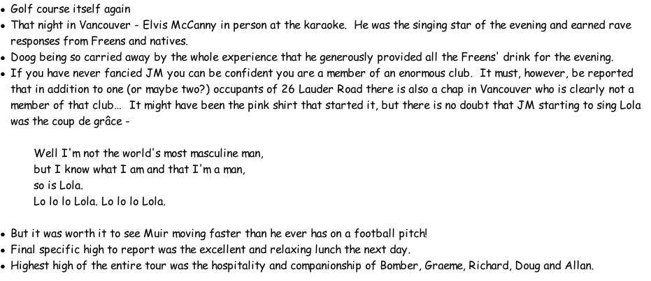 The morning round on the Mount Kidd course seems to have been won by DP with a modest stableford score of 34. Jet lag obviously in evidence amongst the party. In the afternoon Richard romped round with 38 points on the Mount Lorette course to win that round and the day.