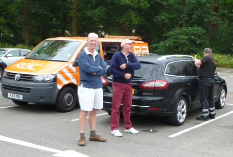 Most right-thinking Freens would regard a stubborn determination not to part with a trophy as being a little unseemly. Unfortunately this is a view that is not apparently shared by Messrs. Runciman and Watters who continue to make every effort to hang on to the Divot they so comprehensively scooped last year. To-day it was the former who made the supreme effort, as testified by the illustration below - and, in case it might be of interest to any Freen in future, holding a mobile ‘phone next to the car while someone at the other end presses a distant key - disnae work! (Dr. Bob feels your pain, Dave.)